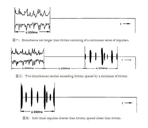 喀嚦聲 (click),一種電壓騷擾,幅度超過連續騷擾準峰值限值,持續時間不大于200ms,而且后一個騷擾離前一個騷擾至少200ms,持續時間由超過測量接收機中頻參考電平的信號確定。一個喀嚦聲可能包含許多脈沖,在這種情況下,相關時間是從第一個脈沖開始到最后一個脈沖結束的時間。