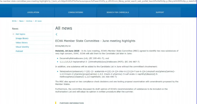 2025年06月16日,歐洲化學品管理局(ECHA)發布消息,將3種新關注物質正式列入SVHC候選清單中。至此,SVHC清單共包含250項物質。