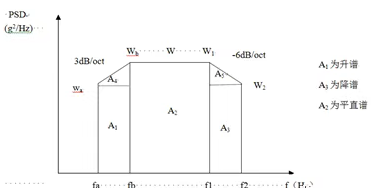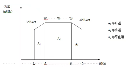 為了簡(jiǎn)便起見,往往將功率譜密度曲線圖劃分成若干矩形和三角形,并利用上升斜率(如3dB/oct)和下降斜率(如-6dB/oct)分別算出wa 和w2,然后求各個(gè)幾何形狀的面積與面積和,再開方求出加速度總均方根值。