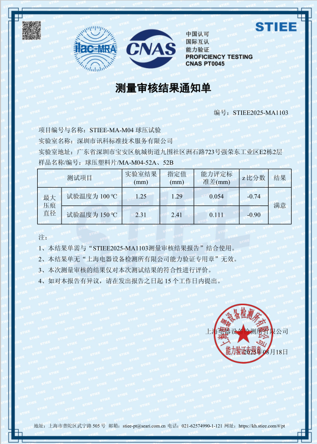 我司STIEE-MA-M04 球壓試驗能力驗證圓滿通過,我們秉承科學嚴謹的工作態度,以客戶為中心,高效統籌安排測試計劃,竭力縮短測試時間的周期,為客戶提供快捷、公正的第三方咨詢檢測等服務。服務區域遍布廣東廣州、深圳、東莞、佛山、中山、珠海、清遠、惠州、茂名、揭陽、梅州、江門、肇慶、汕頭、潮州、河源、韶關及全國各地如您有相關產品需要咨詢,歡迎您直接來電咨詢我司工作人員,獲得詳細的費用報價與周期方案等信息,深圳訊科期待您的光臨!