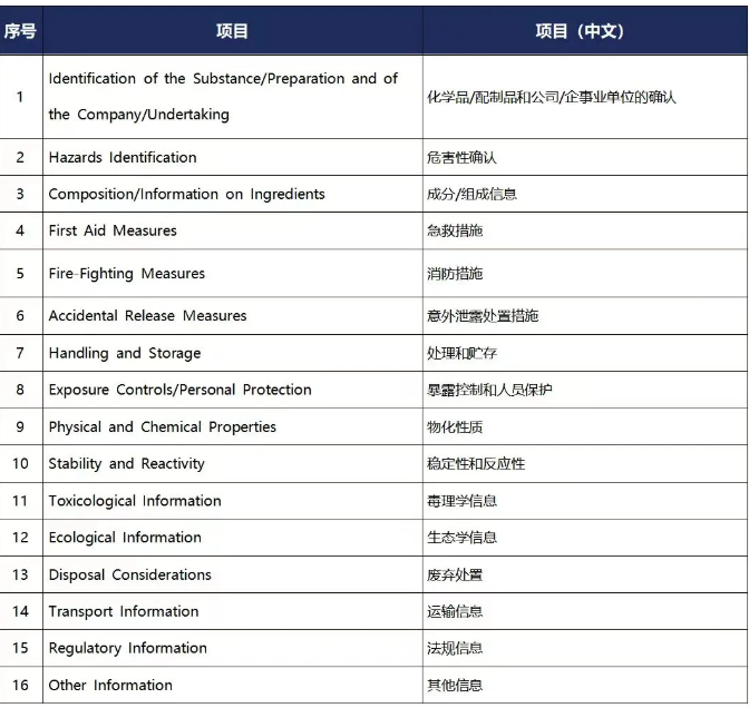MSDS有規定格式和標準依據,不同國家有不同的MSDS標準,常規MSDS一般包括16項: