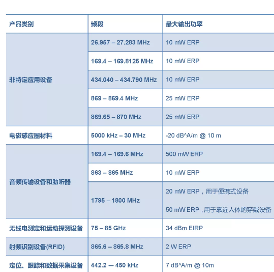近期,摩洛哥國家電信管理局(ANRT)發布了一項新的短距離無線通信設備(SRD)規定ANRT/DG/N°07/2020。新規定為SRD設備的各種使用場景提供了額外的頻段,例如大功率射頻識別,其他技術要求保持不變。新增的頻段及其最大輸出功率限制如下: