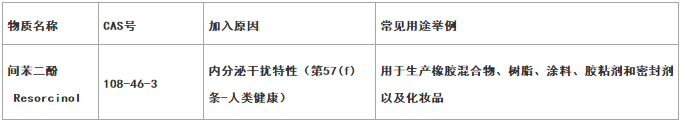 在2020年3月,間苯二酚就曾因其“內(nèi)分泌干擾特性(第57(f)條-人類健康)”被ECHA列入第23批評(píng)議物質(zhì),而在2020年6月公布的SVHC清單,因成員國(guó)委員會(huì)未能達(dá)成一致意見,所以沒(méi)有將間苯二酚正式納入SVHC清單。此次就其內(nèi)分泌干擾特性,間苯二酚再次成為SVHC評(píng)議物質(zhì),并被提議于2021年第四季度作為第26批列入SVHC清單