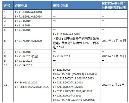 玩具安全指令2009/48/EC參照的協(xié)調(diào)標(biāo)準(zhǔn)完整列表(自2021年5月31日起)如下表: