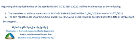 IEC 62368-1: 2018 (即SASO IEC 62368-1:2020) 的強制執行日期延后至2023年1月1日 ,也就是自2023年1月1日起將不再接受IEC 62368-1:2014第二版的CB證書與報告,只接受IEC 62368-1:2018(第三版)的CB證書與報告 。