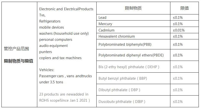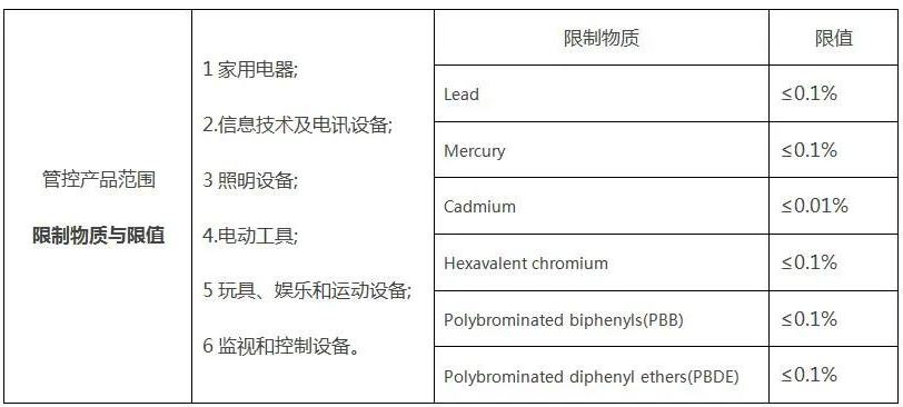 該標準的目的在于消除電子電器產品中的鉛、汞、鎘、六價鉻、多溴聯苯、多溴二苯醚以及四種鄰苯共10項物質。