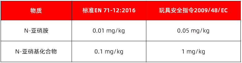 注:標準EN 71-12:2016中第4.2條表2第a點中的限值(即針對意圖供36個月以下兒童使用,且意圖或可能放入口中的彈性體玩具的限值)低于玩具安全指令2009/48/EC附件II第III部分第8點中規定的符合的限值。這些限值具體如下: