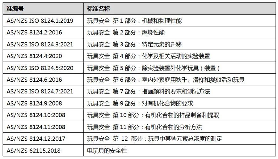 在玩具的自愿性標準方面,澳大利亞基本上采用國際標準ISO 8124系列標準,歐盟EN71系類標準。主要標準如下表所示: