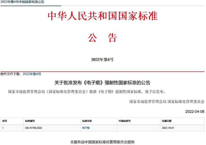 2022年4月12日,國家市場監督管理總局(國家標準化管理委員會)批準《電子煙》強制性國家標準,標準編號為GB41700-2022,由2022年10月1日起實施。