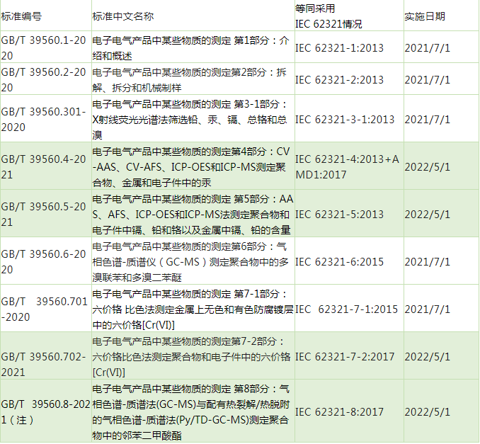 國家市場監督管理總局(國家標準化管理委員會)分別于2020年12月14日和2021年10月11日分兩個批次批準并發布了電子電氣產品中某些物質的測定GB/T 39560系列標準共計9個標準。針對XRF篩選測試、聚合物中多溴聯苯和多溴二苯醚以及鍍層中六價鉻的測試標準已于2021年7月1日正式實施,而對聚合物、金屬和電子件中的鉛、鎘、汞、鉻以及聚合物和電子件中六價鉻、聚合物中鄰苯二甲酸酯的測試標準將于2022年5月1日正式實施。